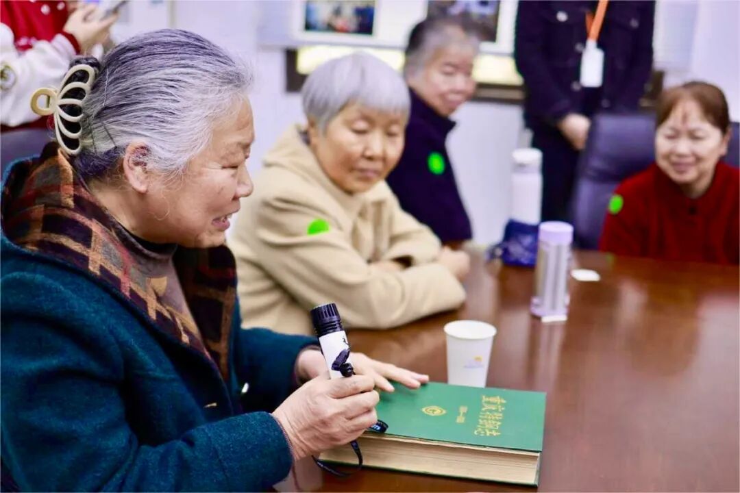最让人动容的是周阿姨带来的《重庆特钢志(1935-1984)》。她之前在车间当车工,现在闲暇时常翻阅这本记载着特钢厂故事的老书。在一旁工作的编辑部蒋阿姨看到这本特钢志后感慨万千,指出这不仅记录了工厂的历史和工人的付出,而且从排版到印刷都是由工人们手工完成的,实属不易。