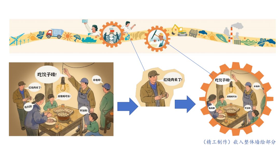刘春利向居民展示了左边的墙绘设计:复古风格的老特钢场景——包括工友们集体参加歌咏比赛(背景是老特钢厂的大烟囱)以及一个停电夜晚,工友们与家人围坐在一起吃大锅饭的画面;右边的墙绘则加入了花朵元素,并引入了与重庆陆海国际传播公益基金会合作的“山城生态基因库”项目,邀请在渝留学生志愿者与居民共同创作花园墙绘,这一提议得到了居民们的积极响应和点头赞同。