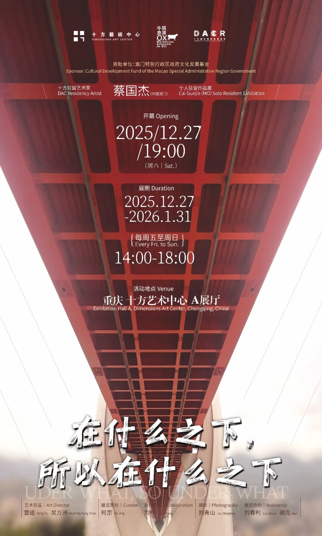 2025年12月27日晚7:00,中國澳門藝術家蔡國傑在重慶十方藝術中心的個人駐留作品展如期舉行,主題名為《在什麼之下,所以在什麼之下》。本次展覽開幕由十方藝術中心國際藝術駐留項目負責人何京主持。