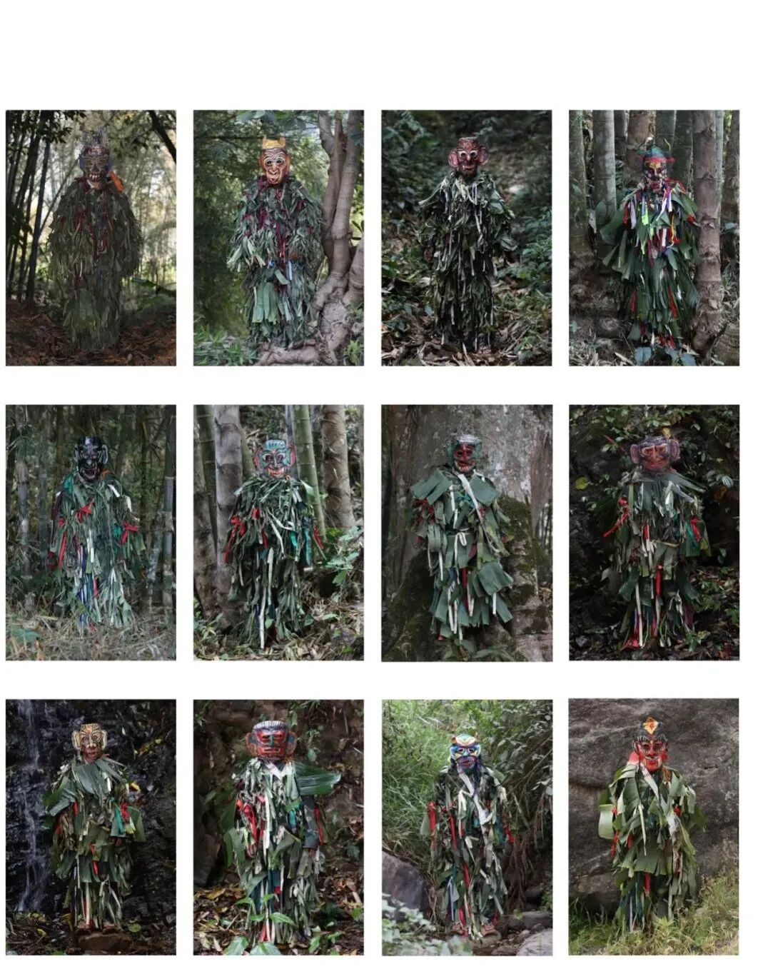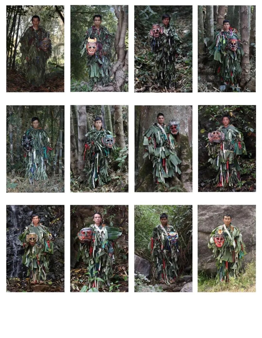 它們是土地、樹根、牛、猴、鹿、蛇、野人及護衛,他們也是農民、打工者、曾經的癮君子和賭徒。健身者、傳承人、演員、模範、信徒,多元一體的角色依附在他們身上,同時也是脫貧致富與傳承保護的矛盾體。不管他們是誰、什麽職業,當他們戴上面具,就是神靈的代言者,脫下面具便做回自己。我采用了一種對比的方法,戴面具一張加脫掉面具一張的拍攝方式,是為了更完整地還原真實,神與人的面容,面具的使用對角色產生了巨大的變化,背景選擇在長有地方特有竹子的聖山裏,突出地域特性。依山而居、傍水而生,養育著世世代代傣族人民,人們從自然中獲取,並敬畏自然。他們是雲南省與緬甸邊境上,一個叫賀哈的傣族寨子的村民,最後一群山神舞者。